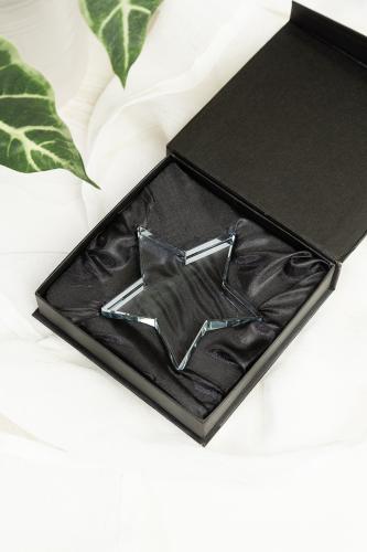 Star shaped glass trophy, in black gift box.