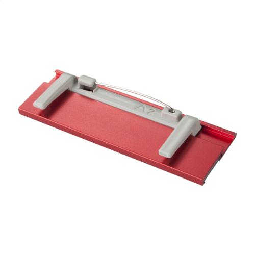 Aluminium name tag pin with replaceable paper and plastic parts.
