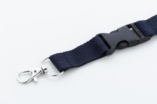 RPET polyester lanyard with detachable metal carabiner and safety buckle.
