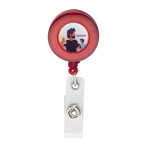 Plastic badge holder with press-stud closure, telescopic line and metal clip.