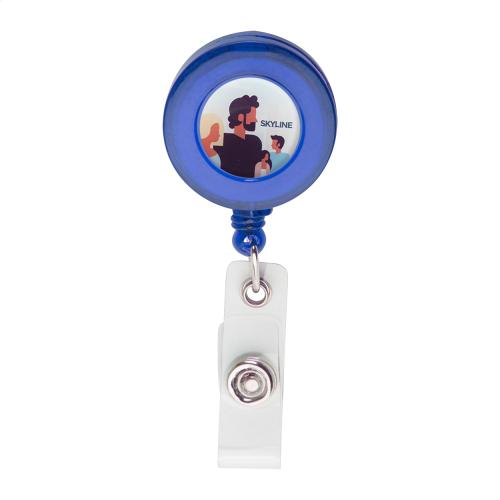 Plastic badge holder with press-stud closure, telescopic line and metal clip.