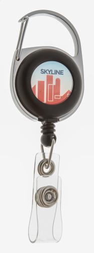 Metal and plastic badge holder with telescopic line and carabiner.