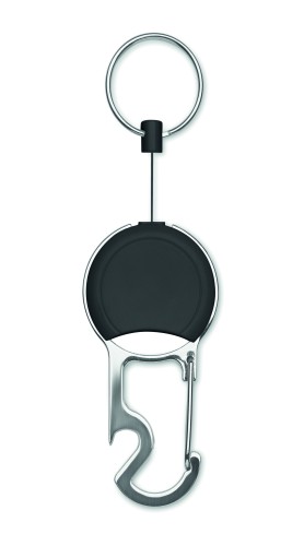 Retractable badge holder in ABS with clip, key ring and bottle opener.