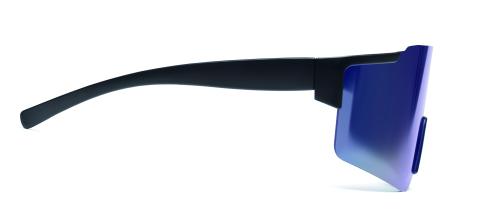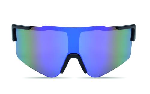 Sports sunglasses with mirrored lenses and black frame. UV400 protection.