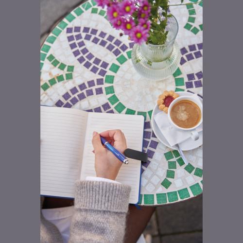 PU A5 notebook with 256 lined pages, ball pen sleeve and space for 6 credit cards.