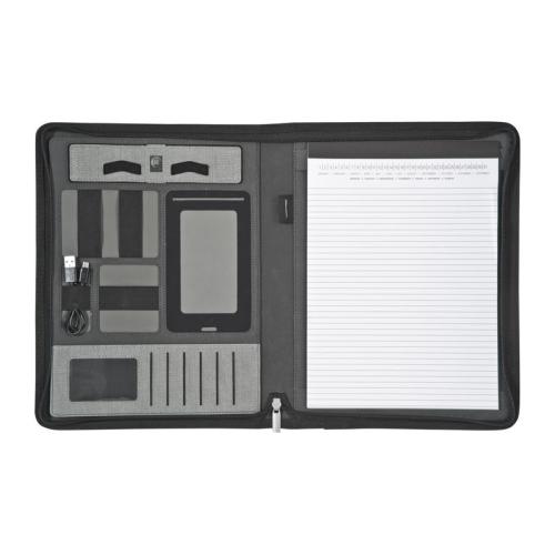 A4 folder made of bonded leather with integrated powerbank (5.000 mAH capacity), USB-cable, 8 pockets, cell-phone pocket, ball pen loop, tablet pocket and a note pad.