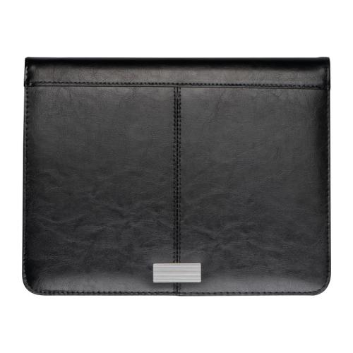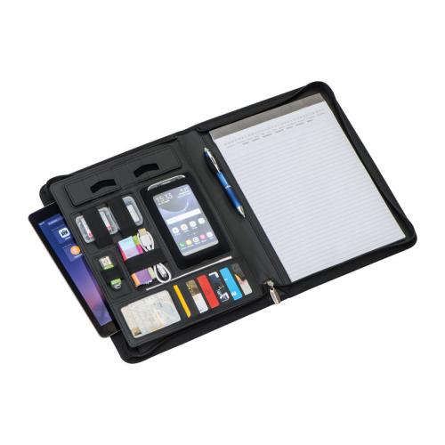 A4 folder made of imitation leather, with zipper, slip pocket, business card slots, pen loop, smartphone holder and stand, compartment for tablet or notebook, and lined block with a small calendar impression.