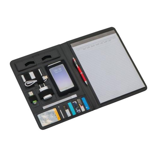 A4 folder made of imitation leather, slip pocket, business card slots, pen loops, smartphone holder and stand, and lined block with a small calendar impression.