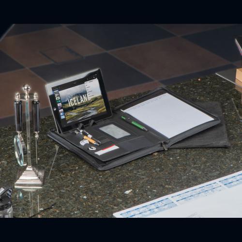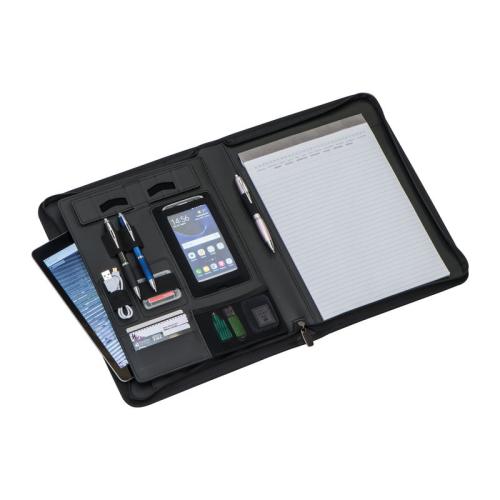 A4 folder made of imitation leather, with business card slots, pen loop, smartphone holder and stand, and lined block with a small calendar impression.