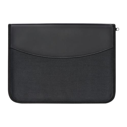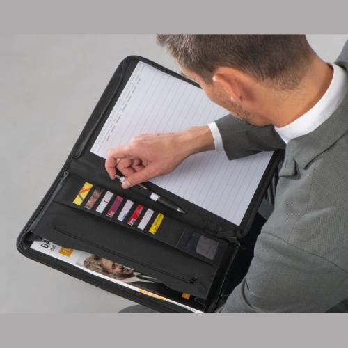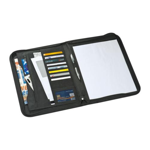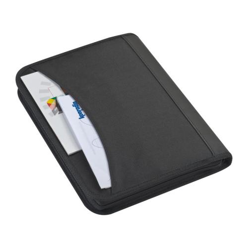 A4 conference folder made of 600D polyester, with note pad, several organizing compartments, and zipper.