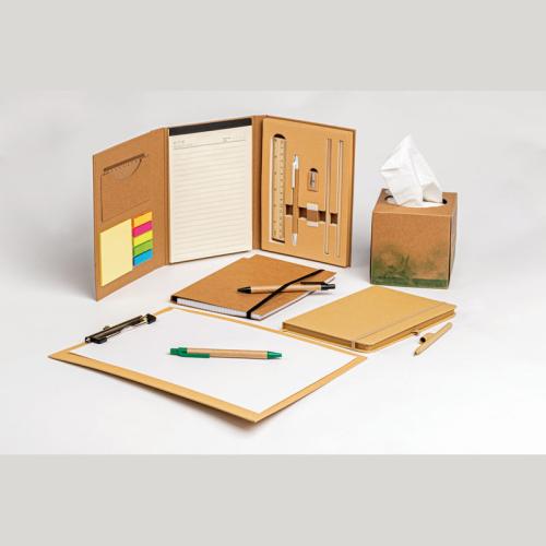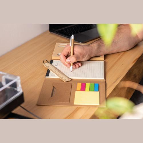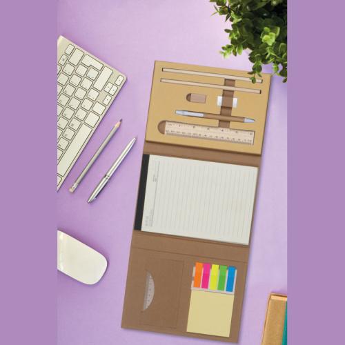 Double foldable writing case made of cardboard with closing rubber band. The case includes an 80-pages note pad, 20 coloured sticky markers in 5 different colours, notes, two rulers, pen, sharpener, eraser, and two pencils.