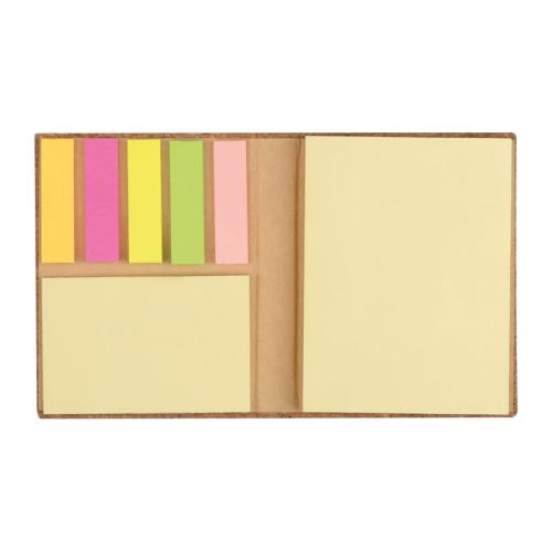 Notebook in a cork cover with 5 different coloured sticky markers (25 pieces each), yellow sticky notes (25 pieces) and a pad with 200 pages.
