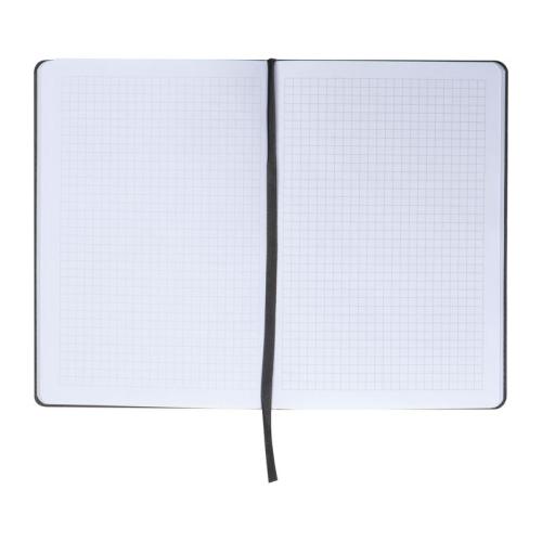 A5 notebook with felt cover, ribbon, rubber band closure, and 192 squared pages.