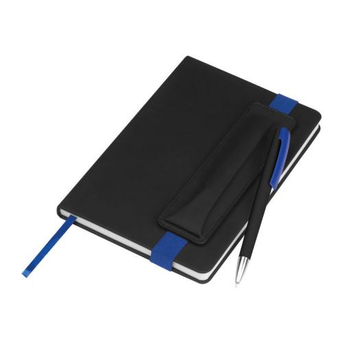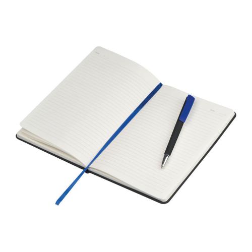 A5 Notebook with PU-Cover, 192 ruled Papers, Bookmark and an elastic band to close, including Pen Holder.