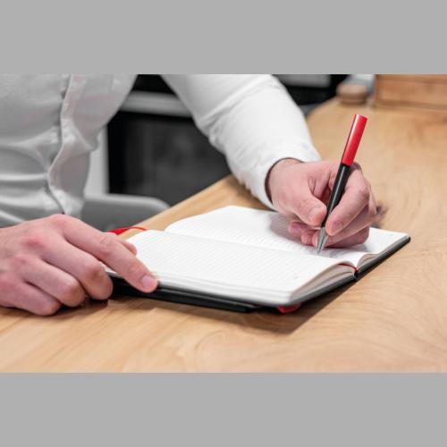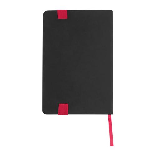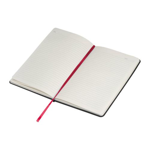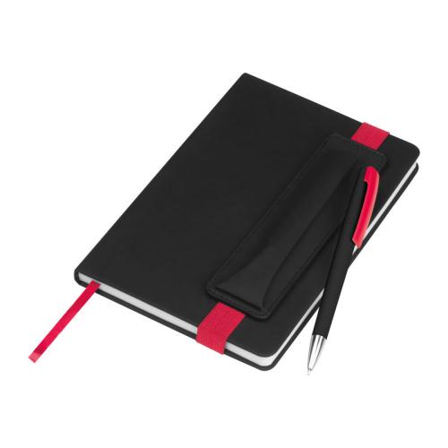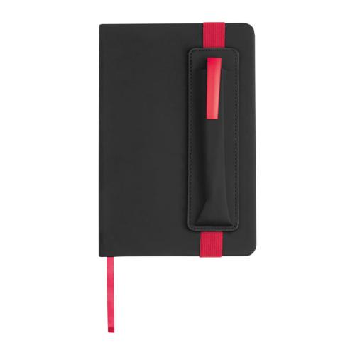 A5 Notebook with PU-Cover, 192 ruled Papers, Bookmark and an elastic band to close, including Pen Holder.