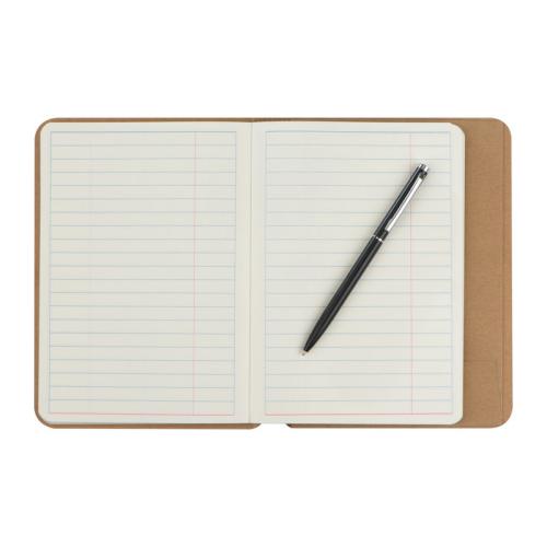 Notebook with rubber band for closing, 120 lined pages and extra compartment.