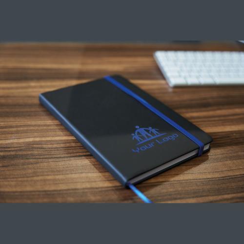 A5 notebook with imitation leather cover and 192 lined pages, coloured ribbon marker and elastic band.