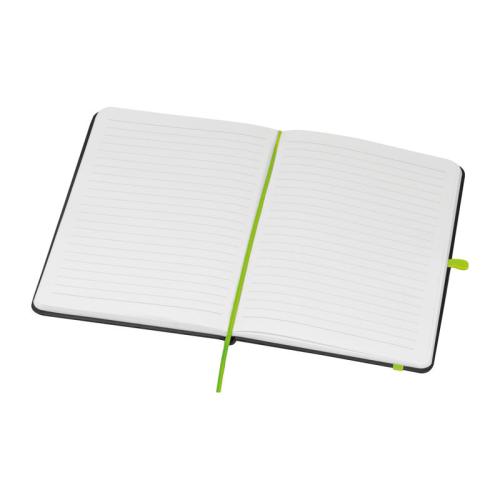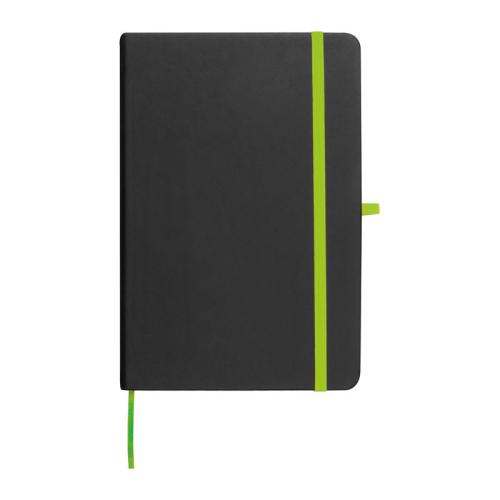 A5 notebook with imitation leather cover and 192 lined pages, coloured ribbon marker and elastic band.