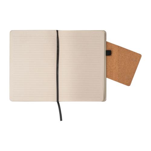 Notebook with a cover made from recycled milk carton, a magnetic closure made from cork and 160 lined pages made from sugar cane, ribbon marker and biros loop.