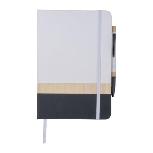 A5 notebook with ballpoint pen. The notebook is made of recycled paper (160 lined pages), bamboo, and PU. The matching pen is made of aluminum and bamboo. Perfect for notes, ideas, sketches, and more.