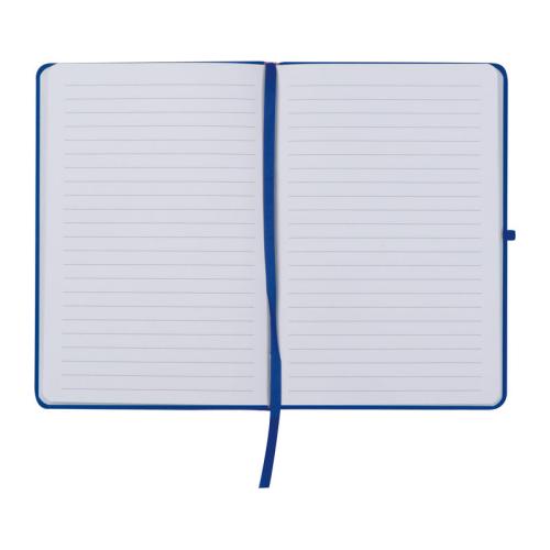 A5 notebook with 160 lined pages and hard cover made of PU for notes. With black bookmark and rubber strap.