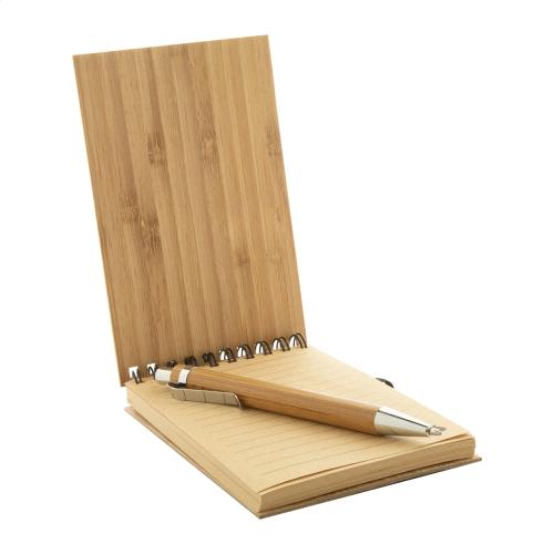 Bamboo covered spiral notebook with 70 lined sheets. Including bamboo ballpoint pen with blue refill.