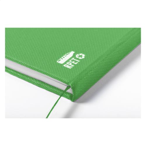 RPET polyester covered notebook with 80 lined sheets, bookmark and rubber strap. A5 size.