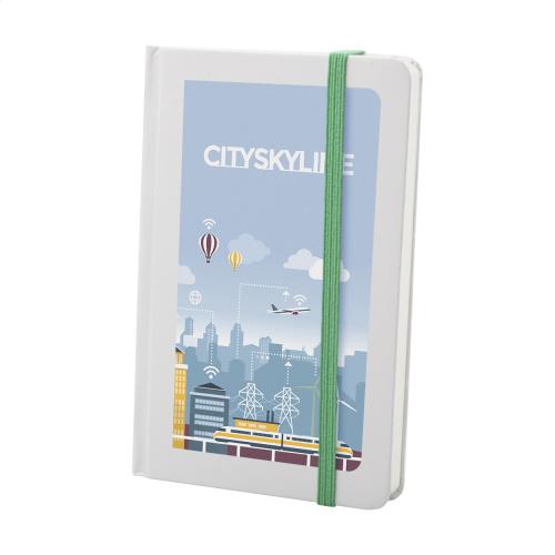 White carton covered notebook with 80 blank sheets and coloured rubber strap. A6 size.