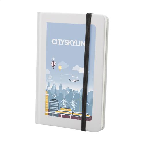 White carton covered notebook with 80 blank sheets and coloured rubber strap. A6 size.