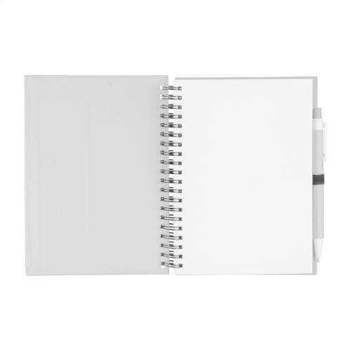 Carton covered spiral notebook with 70 blank sheets, and matching colour recycled paper ballpoint pen with blue refill.
