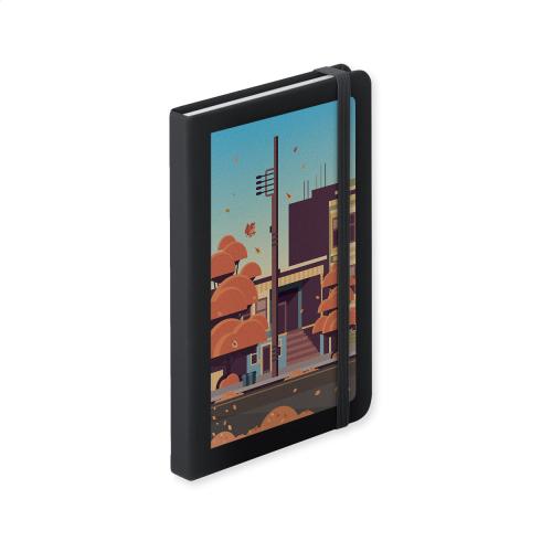 PU leather covered notebook with 100 lined sheets and rubber strap.