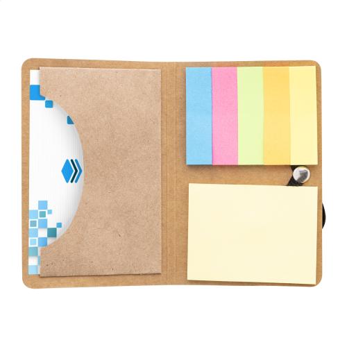 Kraft paper card holder with recycled paper sticky notes and elastic closure strap. Including 25 sheets yellow sticky notes and 125 page markers (in 5 colours).