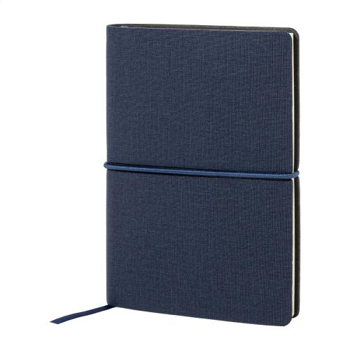 Recycled PU leather covered notebook with 70 lined sheets in recycled paper, 25 sticky notes and 125 page markers (in 5 different colours). With bookmark and horizontal rubber strap. A6 size.