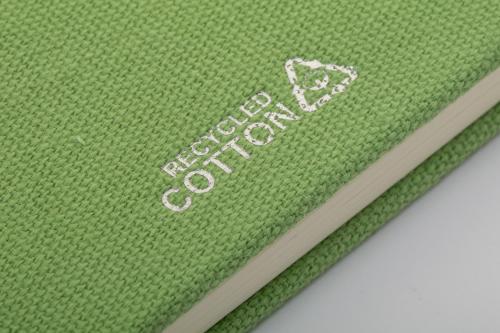 Recycled cotton covered notebook with 80 lined sheets in recycled paper. With matching colour bookmark, rubber band and pen holder. A5 size.