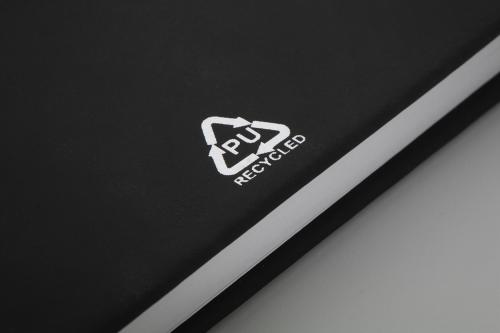 Recycled PU leather covered notebook with 100 blank sheets in recycled paper. With matching colour bookmark and rubber band. A5 size.