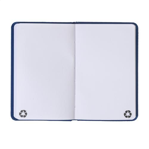Recycled PU leather covered notebook with 100 blank sheets in recycled paper. With matching colour bookmark and rubber band. A6 size.