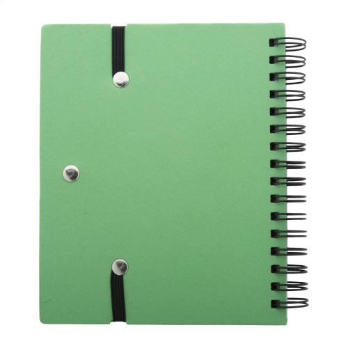 Recycled paper spiral notebook with 70 lined sheets and 125 page markers (in 5 different colours). With rubber strap and pen holder. A6 size. Including recycled paper ballpoint pen with blue refill.