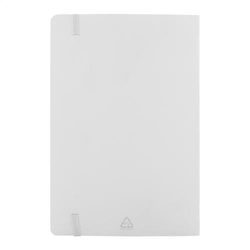 Recycled PU leather, soft cover notebook with 80 lined sheets in recycled paper. With matching colour bookmark and rubber band. A5 size.