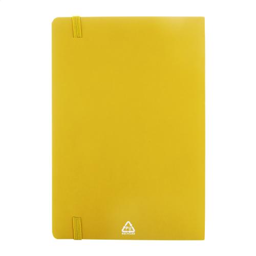 Recycled PU leather, soft cover notebook with 80 lined sheets in recycled paper. With matching colour bookmark and rubber band. A5 size.