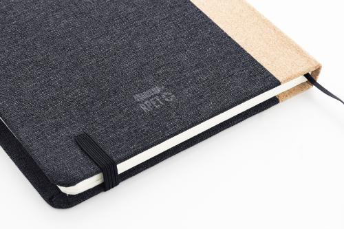 RPET polyester covered notebook with natural cork spine and 80 lined sheets in recycled paper. With bookmark, rubber strap and pen holder. A5 size.