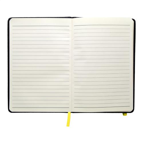 Textured PU leather covered notebook with matching bookmark, rubber band and pen holder. 96 lined sheets, A5 size.