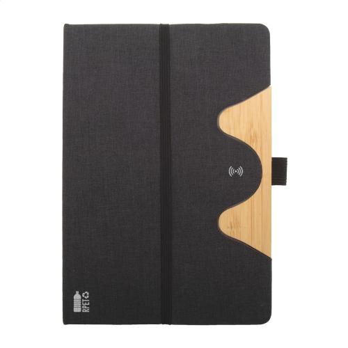 RPET polyester covered notebook with bamboo insert, mobile holder function and built-in wireless fast charger (15W). With 80 lined sheets in recycled paper. A5 size. Including USB charger cable.