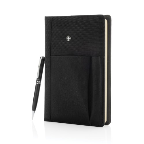 Executive 1680D and 600D polyester notebook cover with pen. Including removable notebook with 192 pages of 80g/m2 paper inside. Pocket on the cover can hold pen, cards, cash, mobile phone etc. Packed in Swiss Peak giftbox.