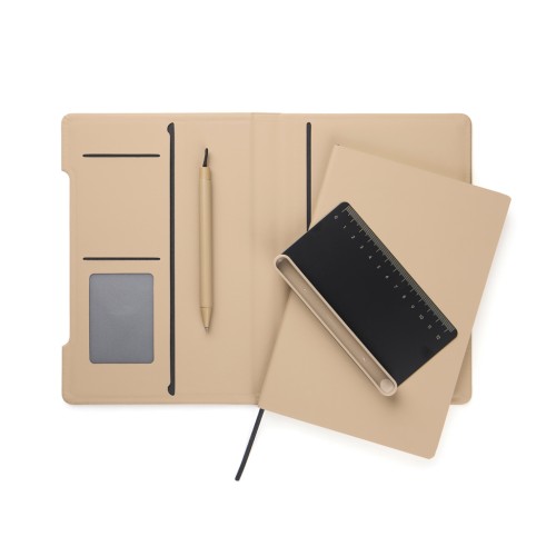 Meet the ultimate multifunctional notebook designed to support your daily workflow. This smart 4-in-1 solution combines practicality, flexibility and design in one. Crafted from RCS certified recycled paper with a cover in classic Baltimore matte PU coating making it as visually appealing as it is functional. A magnetic ruler serves as both a ruler and pen holder including a matching ballpoint pen with blue ink. The pen holder easy transforms into a phone stand integrated into the notebook’s structure. The interior features card holder flaps for convenient storage and an easily replaceable notebook insert for long-lasting use. The A5 sized notebook contains 80 sheets / 160 lined pages, providing plenty of space for notes, planning, and ideas. It is the perfect companion for meetings, travel, or everyday organisation. Total recycled content: 70% based on total item weight. Certified by Control Union, CU1162221.