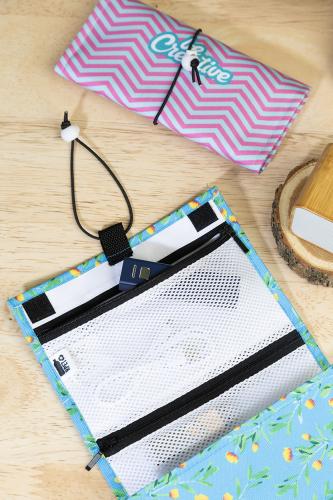 Custom made, RPET cable organizer roll case with 3 zipped mesh compartments and elastic closure strap. With all over sublimation printed graphics. 600D RPET polyester with distinctive RPET label. MOQ: 25 pcs.