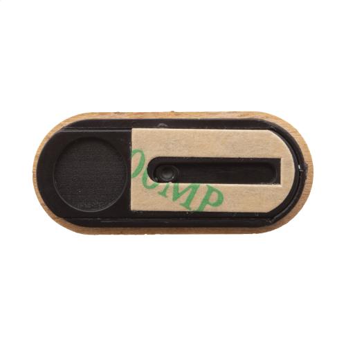 Anti spy webcam blocker with wooden overlay, sliding cover and adhesive back.
