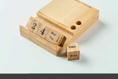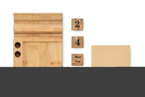 Bamboo desktop calendar with phone holder functionality, 2 pen holders and 50 sticky note sheets. FSC®-certified | FSC 100%, N5.7, FSC-C213206.