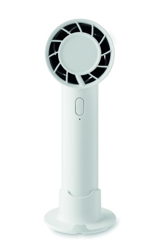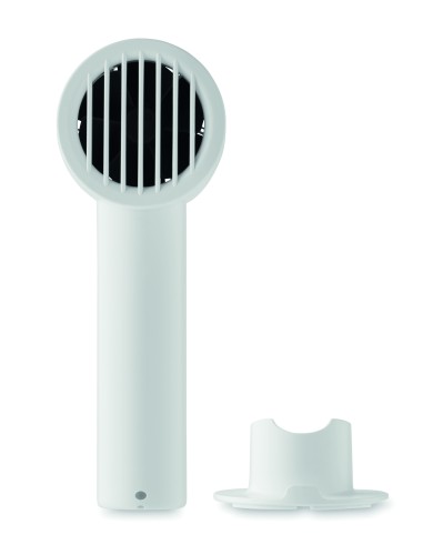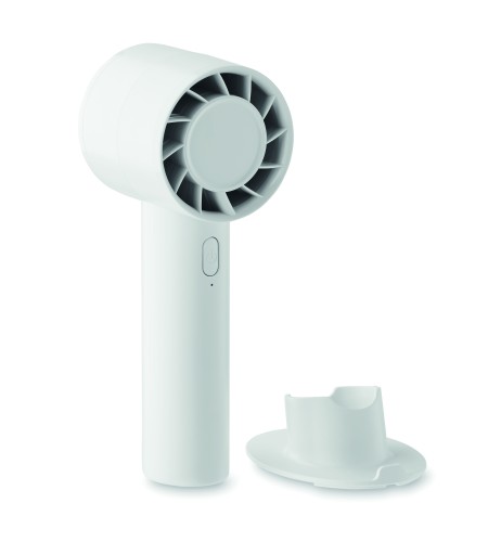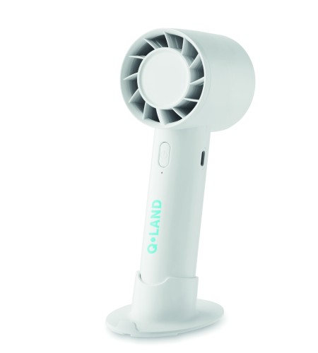 Small portable fan with additional desk stand with phone stand option. 3 speed settings. USB port rechargeable battery 2000 mAh.