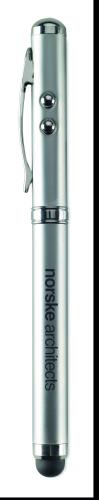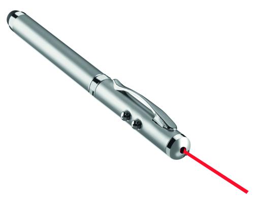 Laser pointer in metal. White LED light, red laser pointer and soft touch tip. Includes 3 button cell batteries. Delivered in metal tin box.