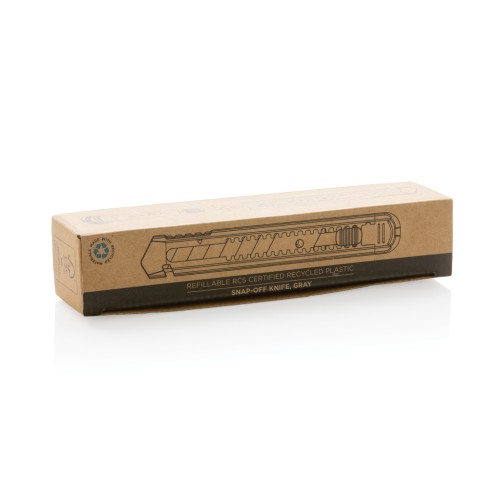 Refillable RCS certified recycled plastic snap-off knife made with RCS (Recycled Claim Standard) certified recycled ABS and stainless steel blade. Total recycled content: 78% based on total item weight. RCS certification ensures a completely certified supply chain of the recycled materials. This versatile knife features a snap-off blade design, allowing you to easily replace the SK4 blade when it becomes dull. Whether you need to cut through cardboard, plastic, or even thin sheets of metal, the snap-off knife is up to the task. The sharp, durable blade ensures that you'll get clean, precise cuts every time. The knife is also incredibly easy to use. The comfortable handle provides a secure grip, allowing you to maintain complete control as you cut. Plus, the lightweight design makes it easy to carry with you wherever you go. Packed in FSC® mix kraft package.